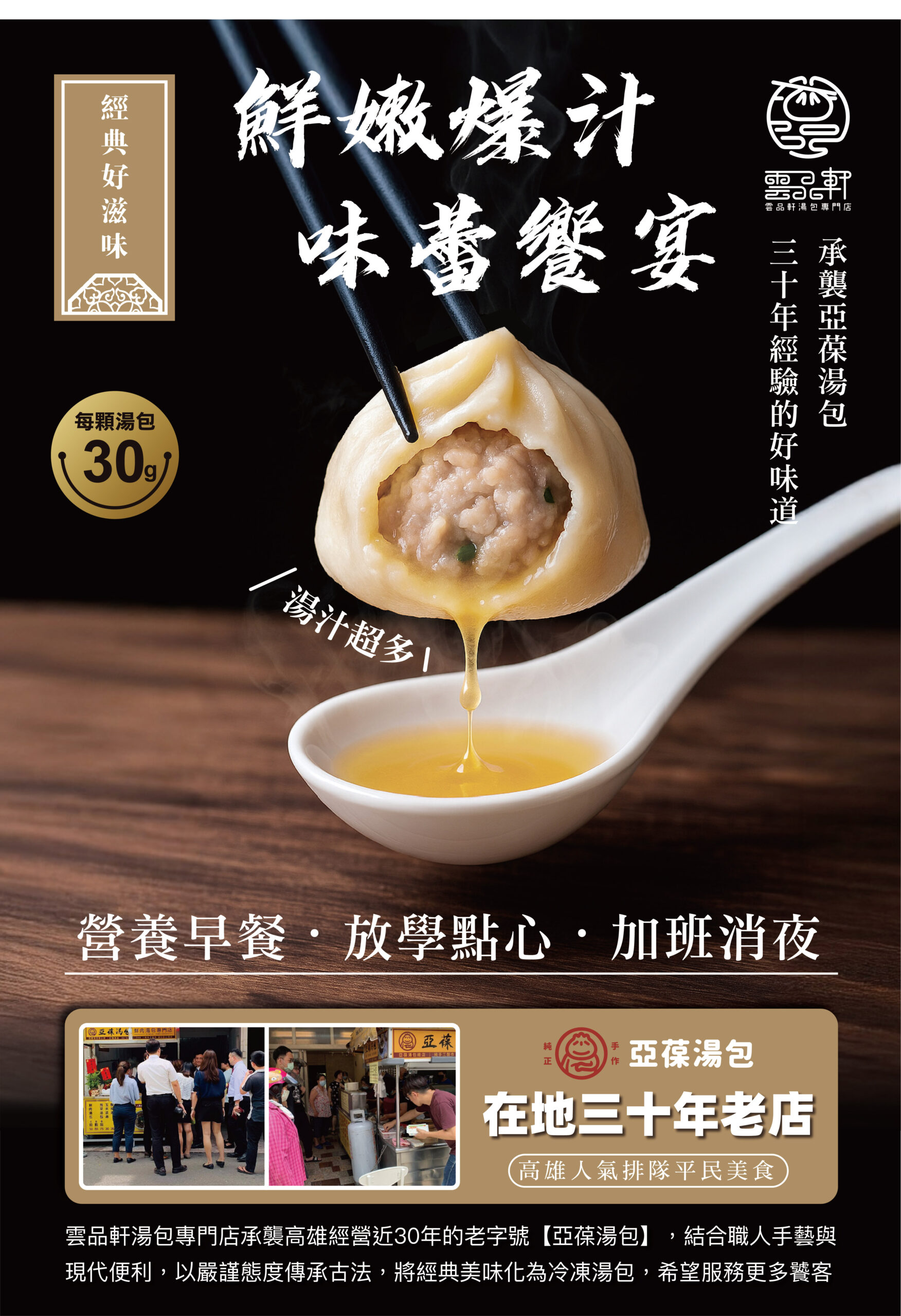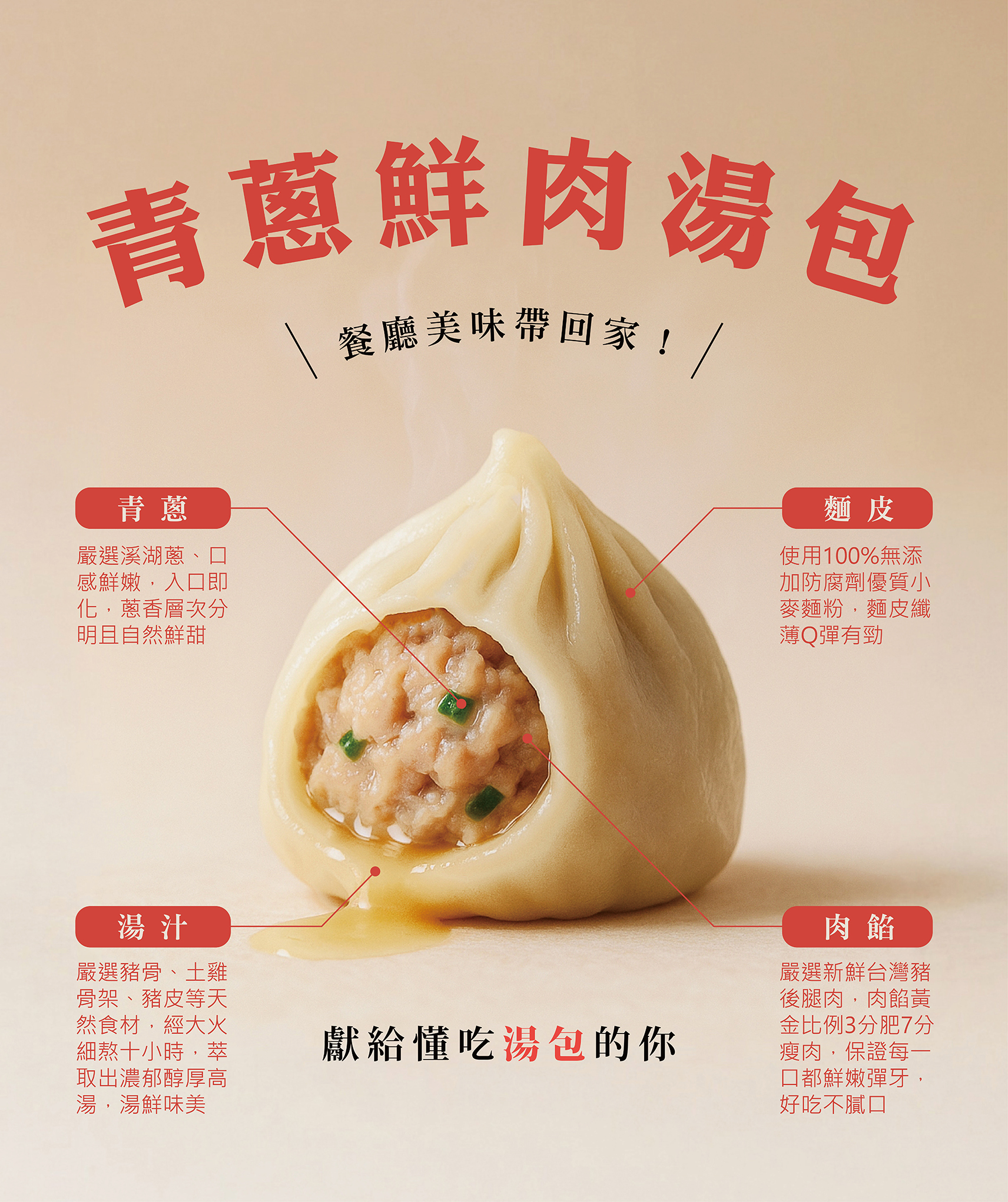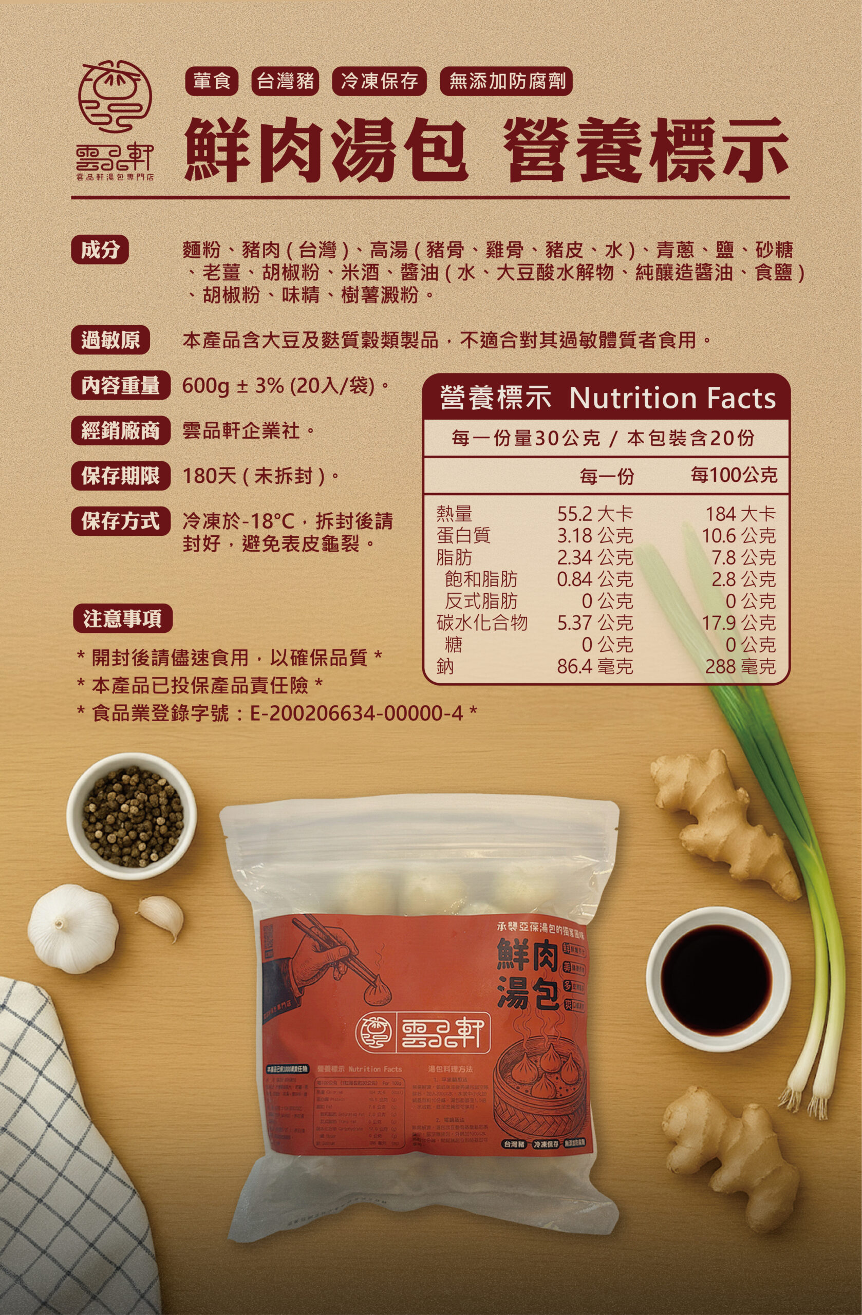 首頁/湯包/青蔥鮮肉湯包(獨享包 / 20顆裝 / 總淨重600g) 青蔥鮮肉湯包(獨享包 / 20顆裝 / 總淨重600g)NT$148 雲品軒 – 爆汁鮮肉湯包 味蕾盛宴! 忙碌的日子裡,只要短短十分鐘,熱騰騰的湯包就能出現在餐桌上~ 古法熬高湯10小時、嚴選新鮮台灣豬後腿肉、嚴選溪湖蔥口感鮮嫩、100%優質小麥麵粉~ 青蔥鮮肉湯包(每顆30克/每包20顆/1~2人份) 獨享包 尚有庫存 青蔥鮮肉湯包(獨享包 / 20顆裝 / 總淨重600g) 數量 加入購物車 分類: 湯包 全館滿額免運 滿$1000免運費!現省$250冷凍運費!滿$2000折$200 描述 相關商品 青蔥鮮肉湯包(分享包 / 50顆裝 / 總淨重1500g) NT$298 加入購物車